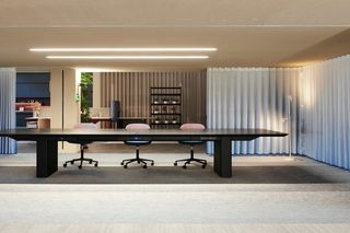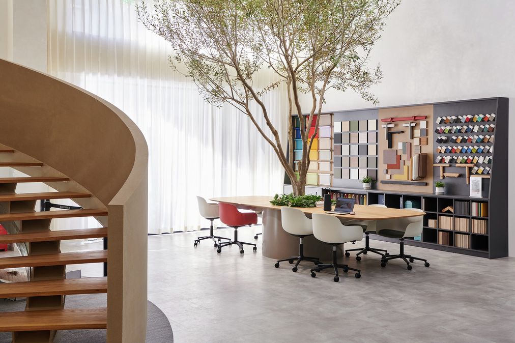 The integration of Silent Gliss products, known for their quiet operation and high-quality fabrics, forms architectural elements that enhance the luxury feel of the space. A wide array of products, including roller blinds, curtain tracks and the stunning vertical wave systems, seamlessly complement the furniture, offering clients a refined and comfortable environment to envision their projects. Adjacent to the showroom is the Baum factory, reinforcing the connection between design and production.