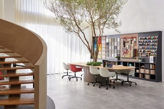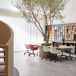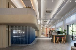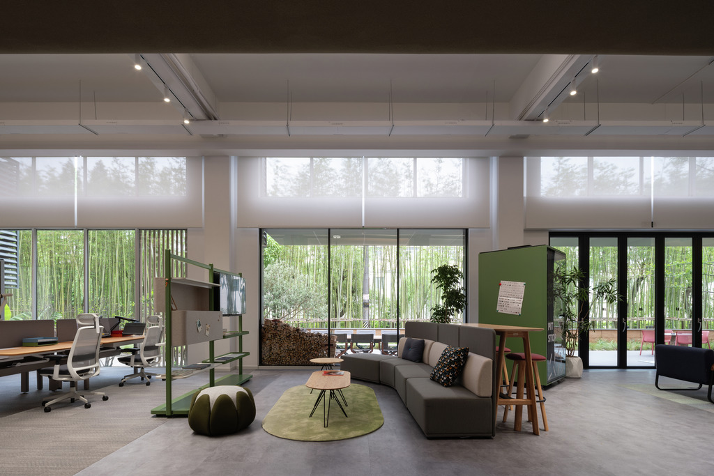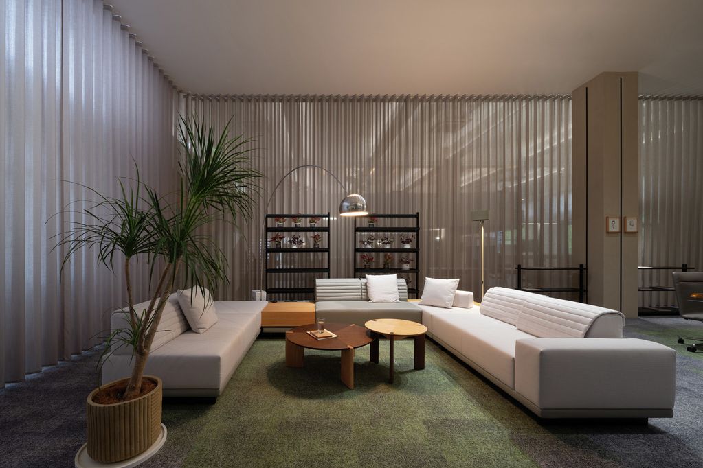 The showroom was thoughtfully designed by Lunar Studio, with designers Luo Jiao and Fan Jingxiao taking full advantage of the original open space with only one row of columns. Their creative use of the structure includes a suspended mezzanine, which allows for multiple floor heights and unique spatial configurations. This design feature enhances the presentation of contemporary furniture and Silent Gliss’s premium curtain and blind systems.